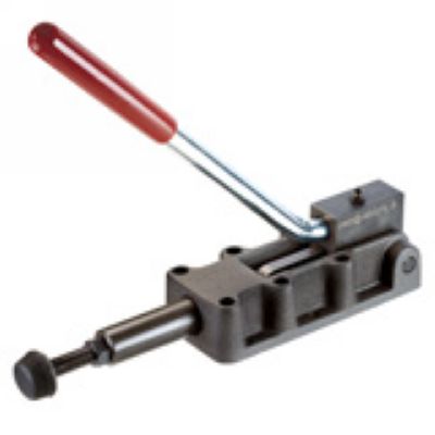 with reversible lever. For push- and pull-clamping. (Equal operation of rod and lever). Heavy-duty version with long rod-guide. Base of malleable casting, burnished. Hardened pins. Lever parts and rod made of tempered steel, burnished. Zinc-coated and pas